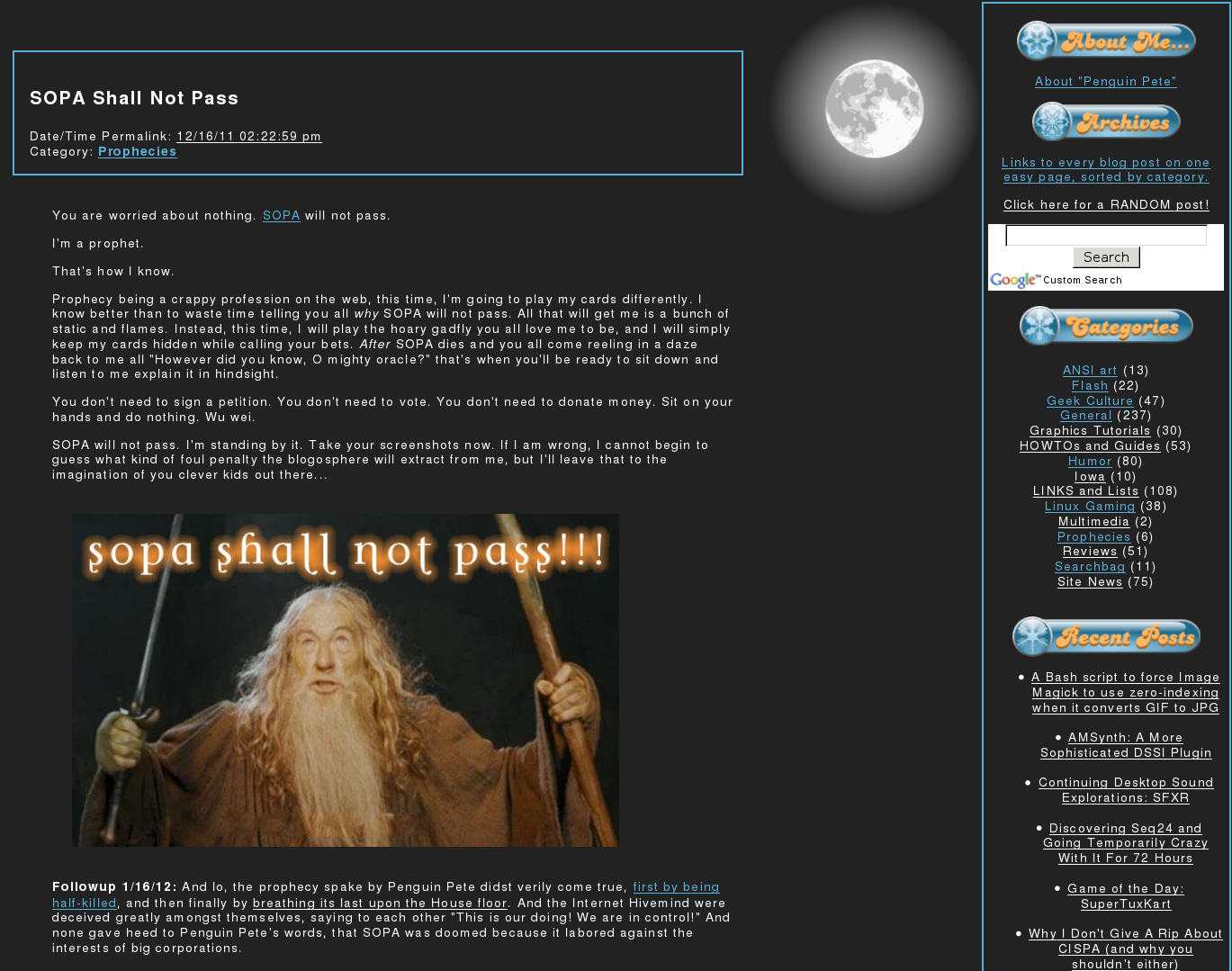 Anyways, my angle shows up. I'm not in the kitchen anymore, I'm just outside the door by now, so he's leaning in to get a better view. And he's all antsy, he's got this – not look, exactly, that's normally what it's called, it's more like feel – he's got this feel about him like "uhg, man, I really should be in there". Because he's an angle, and this is spirit warfare, and this is, like, why he exists, it's what (well, the other thing; still assuming that all this is true) he's good at, it's what he's for. So he looks at me like "dude." And I'm like "Dude, don't let me stop you. This is your thing. Go do what you gotta do." He didn't, of course, I guess I shoulda been explicitly sending him by joining in. I don't really know why. So I told him "You gotta go, go," and he's there antsing, and at this point I turn and go around the kitchen ('cause I'm not going through the kitchen when it's full like that) and back outside. And that's the sixty seconds or thereabouts.